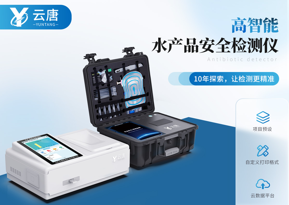 山東云唐智能科技有限公司生產的水產品安全檢測儀可適用于魚、蝦等水產中孔雀石綠、氯霉素、硝基呋喃類:呋喃唑酮(AOZ)、呋喃它酮( AMOZ )、呋喃妥因(AHD)、呋喃西林(SEM)、呋喃那斯、磺胺類、激素類、四環素類、金霉素、土霉素、甲砜霉素、氟苯尼考、喹諾酮類藥物:噁喹酸、諾氟沙星、恩諾沙星、環丙沙星、氧氟沙星等藥物殘留的定性檢測