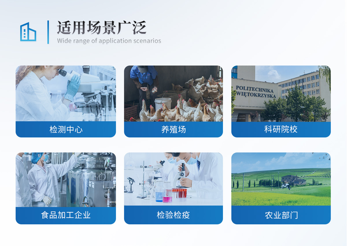 該高智能獸藥殘留檢測儀為集成化食品安全快速檢測分析設備,目前已于食藥監局、衛生部門、高教院校、科研院所、農業部門、養殖場、屠宰場、食品肉產品深加工企業及檢驗檢疫部門等單位廣泛使用。